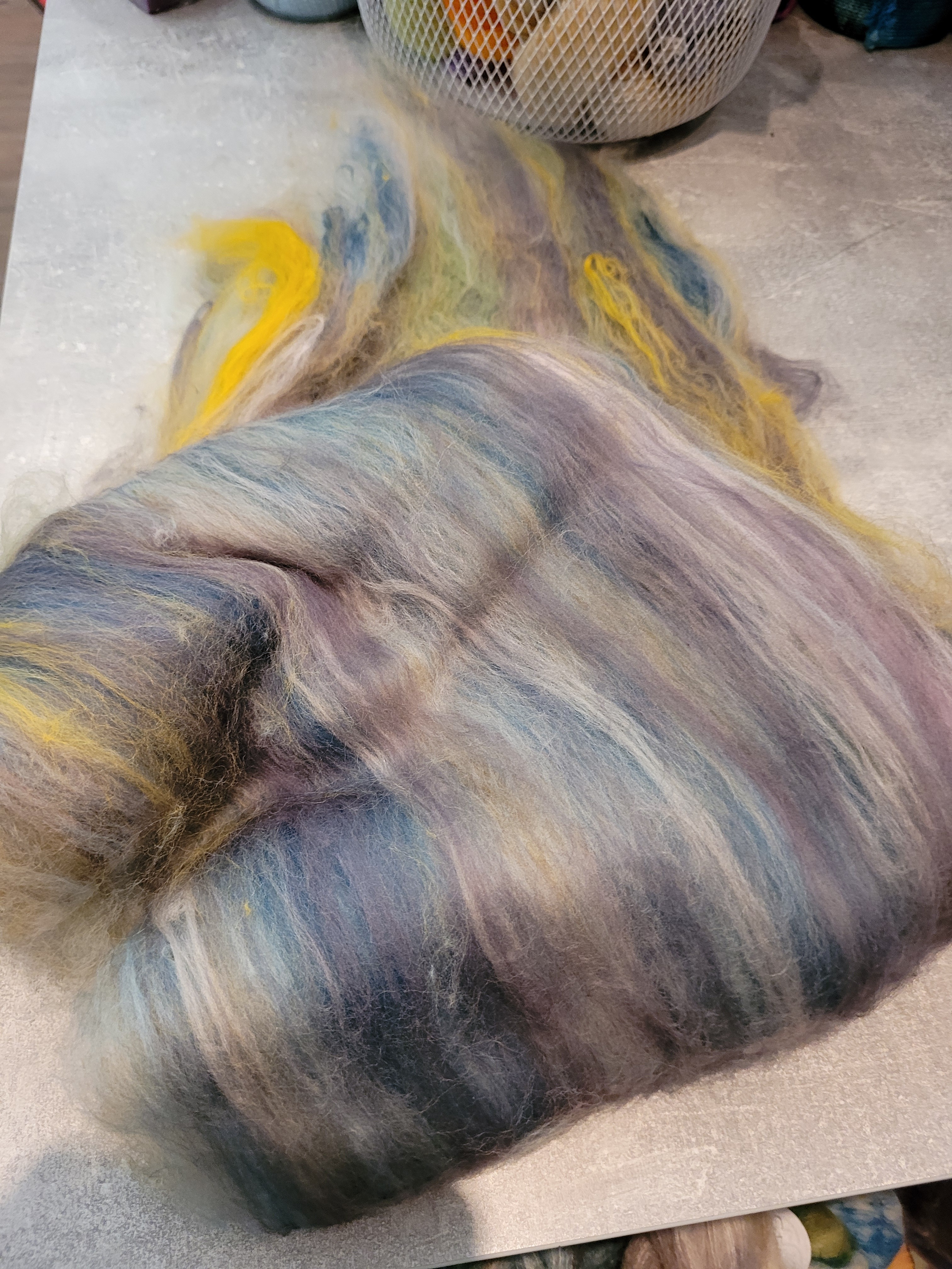 Eigens zusammengestellte Fasern in harmonische Farben werden zu einem handkardierten Wollbatt zusammengefasst.